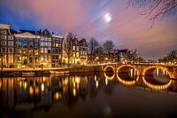 Avond foto van de Keizersgracht Amsterdam, Nederland met oude gevels aan de gracht, inclusief de brug aan de Leidsegracht. Prachtige sfeerfoto met de brug en oude panden verlicht, inclusief een fraaie reflectie in het water van de gracht alsmede een mooie lucht met lichtsporen, onstaan door de lange sluitertijd van de camera.