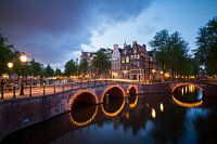 Prachtige opname van de Keizersgracht in Amsterdam na zonsondergang in het blauwe uur met lampjes op de bruggen en een mooie weerspiegeling in het water