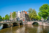 De hoek van de Keizersgracht en de Leidsegracht met toeristen die op een zonnige dag genieten van de stad aan de grachten