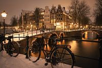 Hoek Keizersgracht en Leidsgracht in Amsterdam met sneeuw