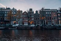 Een beeld van de woningen aan de Keizersgracht in de binnenstad van Amsterdam. De weersomstandigheden op deze koude, winderige dag aan het begin van de lente zorgen voor een mooi samenspel van kleuren in de lucht. Gecombineerd met de lage temperatuur en de warme kleuren van de verlichting zorgt dit voor een typisch, "gezellig" Nederlands beeld.