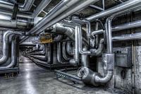 Prachtige opname van een kruispunt in de kelder van een industrieel gebouw met allerlei pijpleidingen alle kanten op