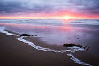 Een dramatische zonsondergang aan de kust. De wind heeft een hoop kelp aangespoeld op het zandstrand.