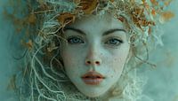 De delicate schoonheid van een bosnimf is hier gevangen in een portret omgeven door een Keltisch aura. Haar huid is bezaaid met sproeten, die doen denken aan het lichtspel op de bosgrond, en haar blik is helder en doordringend als het water van een heilige bron. Haar haar, gekroond met herfstbladeren, lijkt te versmelten met de…