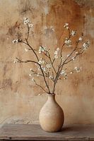 Deze sfeervolle foto toont een rustieke keramische vaas gevuld met delicate bloesemtakken, tegen een achtergrond van verweerd, warmgetint pleisterwerk. Het ontwerp straalt eenvoud en verfijning uit, perfect passend binnen een minimalistische of Japandi-interieurstijl. De zachte kleuren en natuurlijke elementen brengen een gevoel van sereniteit en balans in elke ruimte. Dit tijdloze beeld voegt karakter en rust toe aan zowel moderne als klassieke interieurs. Het is ideaal als wanddecoratie voor bijvoorbeeld een woonkamer, hal of slaapkamer. Combineer het met houten meubels en aardetinten voor een harmonieus geheel.