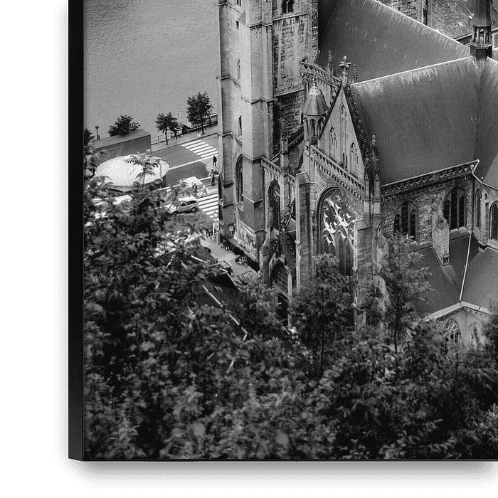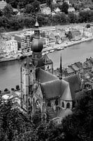 Kerk Dinant Belgie van Bovenaf. De Collegiale kerk Onze-Lieve-Vrouw van Dinant. kerkje aan de la meuse oftwel de maas. mooi in zwart wit gefotografeerd