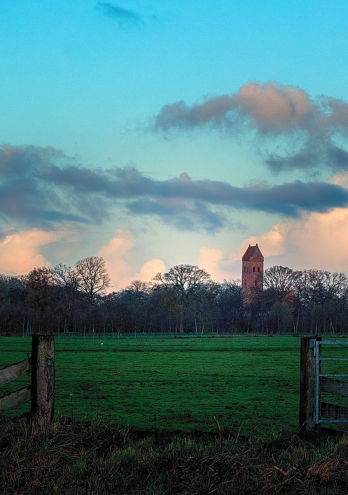 De kerk van Midwolde gefotografeerd vanuit de Nienoordsche polder verlicht door zon- en maanlicht (wat overigens ook reflecterend zonlicht is).