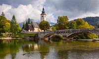 De Katholieke kerk van St Johannes de Doper, mooi gelegen aan de stenen brug over de Sava Bohinjka rivier, en aan het Meer van Bohinj, in noordwest Slovenië.