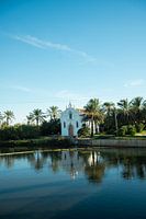 Dit serene beeld, vastgelegd in Valencia, toont een kleine witte kapel omringd door palmbomen en weerspiegeld in het kalme water op de voorgrond. De heldere blauwe lucht en de symmetrische reflectie versterken het gevoel van rust en evenwicht. Architectuur, natuur en licht komen hier samen in een ingetogen en tijdloze compositie. Het…