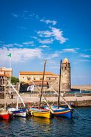 Kerk en haven met zeilboten in Collioure aan de Côte Vermeille i