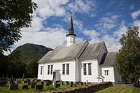 Noorwegen telt naast de 28 staafkerken, ook andere witte houten kerken. Deze foto uit 2017 laat de kerk uit Gjerde zien.
