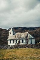 Staande foto van een witte kerk op de Faeröer Eilanden. Een bekend tafereeltje, want je komt vaker van dit soort plekken tegen tijdens een reis op de Faeröer Eilanden.
