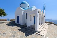 Blauw-witte kerk boven de zee, de Profeet Elias Kerk boven het bergdorp Nikia op het vulkanische eiland Nisyros in Griekenland