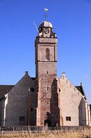 De kerk van Katwijk met strak blauwe lucht. Genomen in 2014 tijdens de ophoging van het strand en de duinen.