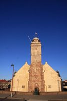 De kerk van Katwijk met strak blauwe lucht. Genomen in 2014 tijdens de ophoging van het strand en de duinen.