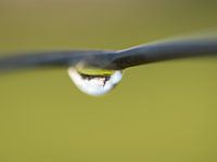 De kerk van Weurt gevangen in een regendruppel die aan een hek hing. De zon brak net door en zorgde voor prachtig licht.