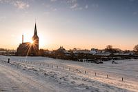 Zonnestralen langs de kerk van Weurt tijdens een koude, winterse ochtend.
