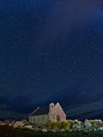 Een eenzame kerk zit onder een sterrenhemel...