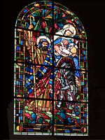 Achter hen staat Josef, herkenbaar aan zijn sobere kleding en de staf in zijn hand, als stille beschermer van het gezin. Zijn blik is op Maria en het kind gericht, in een houding van bescheiden toewijding. De glas-in-loodstructuur, digitaal nagebootst met levendige kleuren en subtiele lichtval, versterkt het sacrale karakter van de voorstelling. Boven de figuren dansen florale en geometrische motieven, die verwijzen naar middeleeuwse glas-in-loodtechnieken.