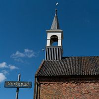 Een blauwe lucht en op de voorgrond een deel van de kerk aan het kerkepad in het dorp Wirdum in de provincie Groningen.