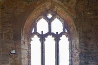 Naast het kerkraam zit een paartje tortelduiven te broeden op hun nest. Binnen is het diffuus licht.