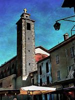 Aan de oever van het meer in Passignano Sul Trasimeno zijn er rijen restaurants en keramiekwinkels, maar deze kerktoren torent boven alles uit. Het moet het mooiste uitzicht hebben op het Lago Trasimeno, het grootste meer van Midden-Italië. Foto kunst.