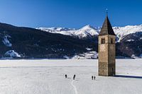 Kerktoren in Reschensee van Jan Schuler