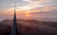 Kerktoren gefotografeerd in de mist tijdens zonsopkomst.