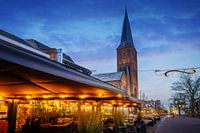 Kerktoren van Hengelo Gelderland in de avond met marktplein op de voorgrond.