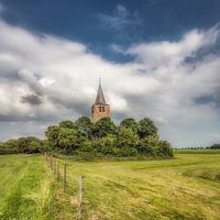 Het kerktorentje van Tsjerkebuorren op het Friese platteland op een zomerse dag vlak na het maaien van het gras.