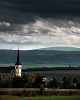 Landschap in de Duitse Eiffel met kerktorentje die de horizontale lijnen doorbreekt