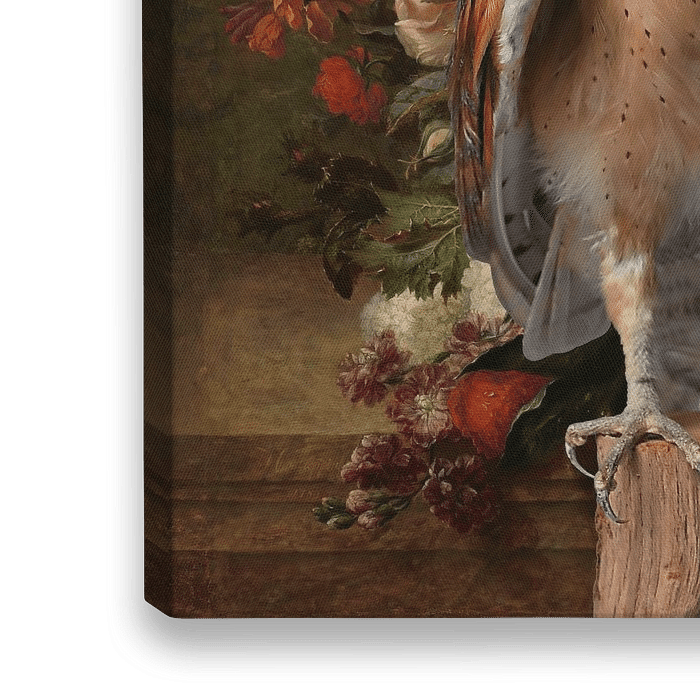 Deze kerkuil matcht qua kleur prachtig met het 18de eeuwse schilderij van een bloemstilleven. De uil komt uit de Betuwe het schilderij is te bewonderen in het Rijksmuseum in Amsterdam. Een landelijk stilleven met warme kleurtonen.