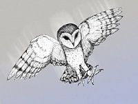 Een tekening met Oost-Indische inkt en kroontjes pen van een kerkuil. De uil vliegt door de lucht in de aanvalshouding met zijn poten voor zich uit gestrekt, klaar om zijn prooi te pakken.
