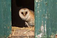 Deze kerkuil kijkt net even om het hoekje van een oud raamkozijn in een landelijk gelegen boerderij.