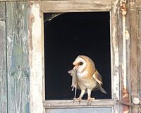 Ik kon deze kerkuil in een oude schuur fotograferen. Hij had net een pooi gevangen en ging in het oude kozijn zitten.