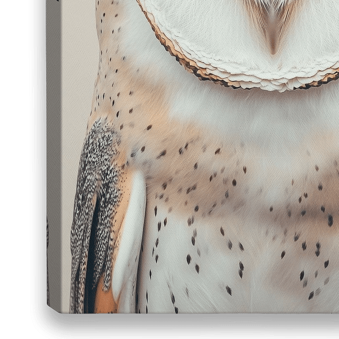 Met wijd openstaande, diepzwarte ogen en een mysterieuze glimlach straalt deze gevederde kerel wijsheid en sereniteit uit. Zijn zachte, crèmekleurige gezicht contrasteert harmonieus met de delicate grijze en bruine veren die hem omringen. Een fascinerende blikvanger die zowel rust als nieuwsgierigheid uitstraalt.