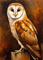 Dit schilderij van een kerkuil in clair-obscur baadt in goudkleurig licht dat zijn bleke, hartvormige gezicht en zwaaiende vleugels verlicht. De schaduwen omlijsten de stilte en geven de uil een aura van mysterie en stille kracht. Schilderachtige texturen geven diepte aan de veren, waarbij elke streek de stille gratie van de nachtelijke vlucht weerspiegelt. Dit werk belichaamt zowel wijsheid als betovering, waardoor het een boeiend middelpunt is voor elke ruimte.