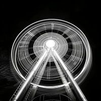 Het reuzenrad tegen de donkere nachtelijke hemel, badend in een zee van licht, waarbij elke omwenteling een moment van verwachting en mysterie creëert.