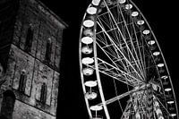 De foto is genomen in 2020 voor de kathedraal in Osnabrück. Het reuzenrad werd daar neergezet voor een speciale markt om de showmannen te steunen tijdens de pandemie in Corona.