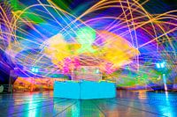 Kermis tijdens een zomerse zonsondergang met verlichte kermisattracties in verschillende kleuren in het park in Zwolle, Nederland, tijdens de zomerkermis. Foto met lange belichting die de beweging van de kermisattractie laat zien.