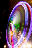 avond opname van een ronddraaiende kermis attractie met lange belichtingstijd. op de achtergrond het historische middeleeuwse stadhuis van Gouda.