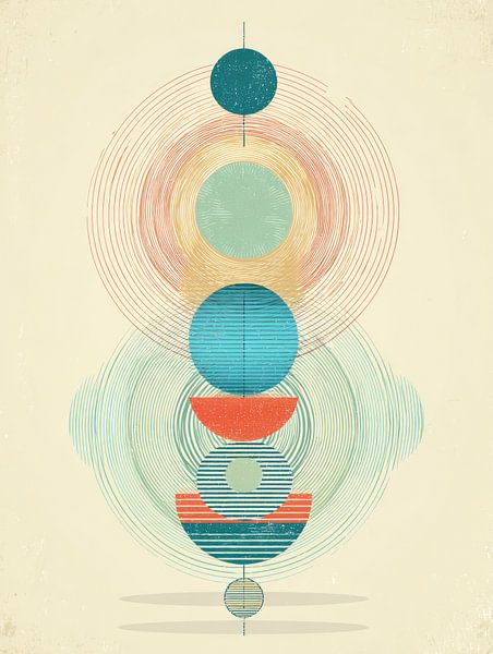 Concentrische vormen en overlappende kleurvelden trekken het oog steeds opnieuw naar het centrum. Dit werk onderzoekt focus, herhaling en samenhang. Een krachtig maar harmonieus beeld dat zowel rustgevend als visueel rijk is.