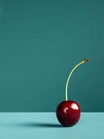 Een moderne minimalistische foto van een kers tegen een bijpassende achtergrond. Past heel goed bij een strak interieur of in een omgeving waar genoten wordt van lekker eten zoals een restaurant of lunchroom.