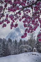 Kersenbloesem tijdens een winterse uitbarsting aan de Wildensee in Mittenwald, met uitzicht op de Viererspitze.