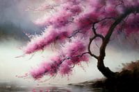 Een kleurrijk digitaal schilderij van een Japanse Kersenbloesem aan een meer in impressionistische stijl. Geïnspireerd door het prachtige Japanse lente landschap. Het werk geeft een zachte warme uitstraling aan uw interieur.
