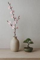Deze kunstprint ademt de verfijnde eenvoud van Japanse esthetiek. Een elegante tak met zachte roze kersenbloesems staat in een neutrale vaas, terwijl ernaast een kleine bonsai in volle kracht en balans schittert. De combinatie van bloeiende kwetsbaarheid en tijdloze stevigheid brengt een harmonieus contrast dat rust en schoonheid in evenwicht houdt.