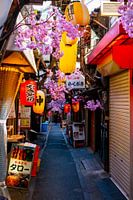Kersenbloesems of sakure decoratie in de nauwe straatjes van Tokyo tijdens de lente. In dit straatje zijn s'avonds verschillende typische restaurantjes en bars te vinden.
