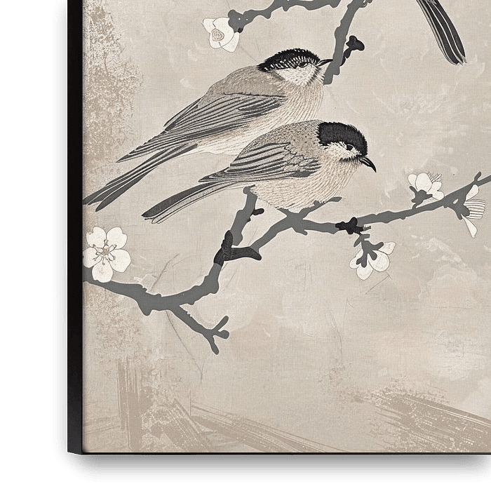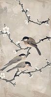 Digitaal kunstwerk met een Japans sausje. Takken met kersenbloesem en drie vogels.