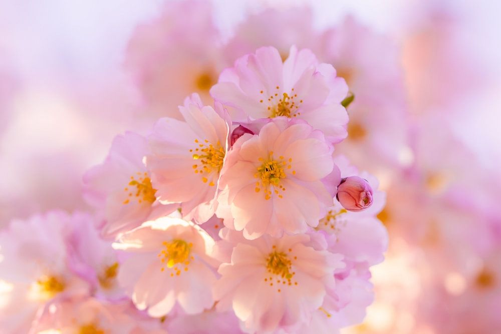 Close-up van een sierkers in bloei op een lentemorgen in Kassel, Hessen, Duitsland.