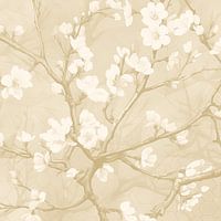 De afbeelding toont een patroon van bloesemtakken met delicate witte bloemen op een achtergrond van lichte beige tinten.